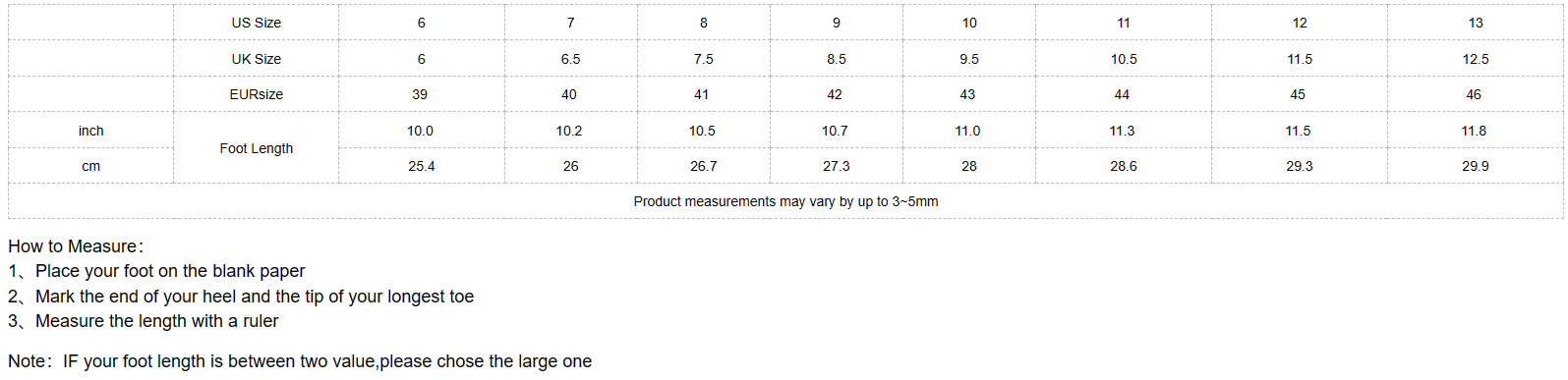 | EUR Size | US Size | Insole Length(inch) | Insole Length(mm) |