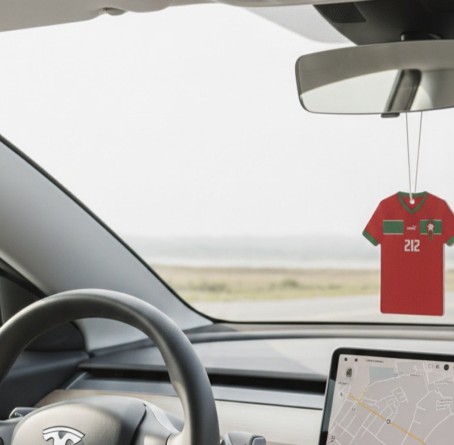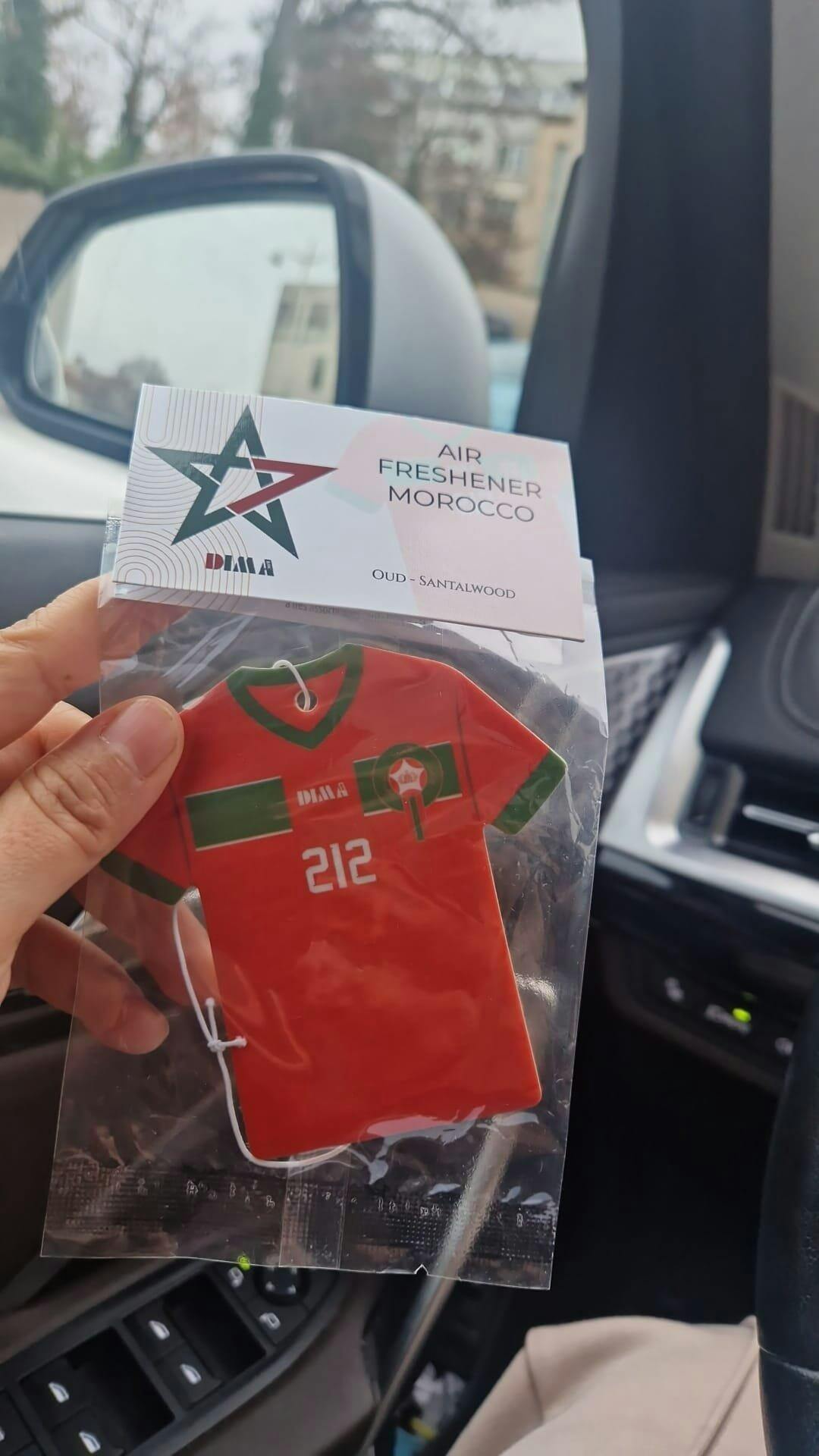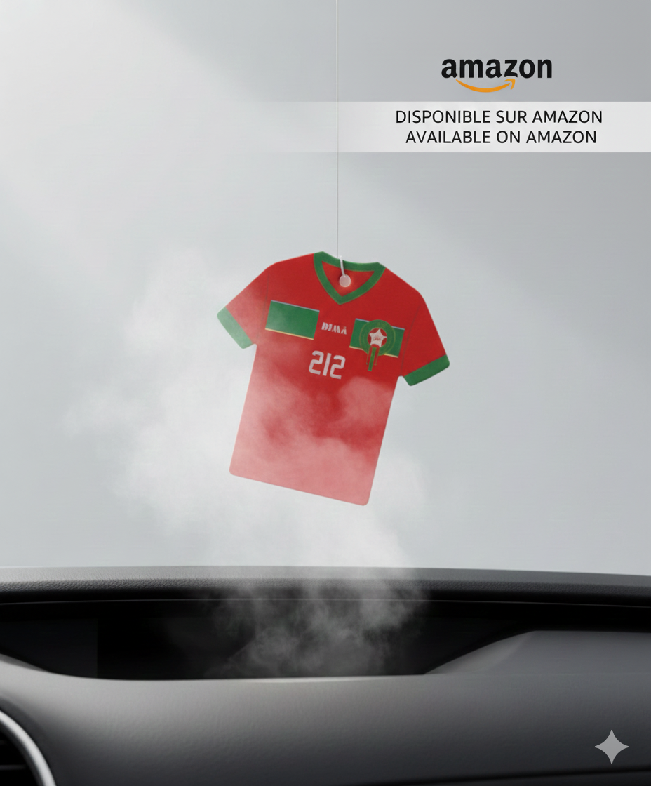 Vêtu des teintes du maillot national, ce produit diffuse une senteur oud-santal fraîche (style Bois Marocain de TOM FORD) qui enveloppe votre véhicule d'une ambiance chaleureuse et authentique.